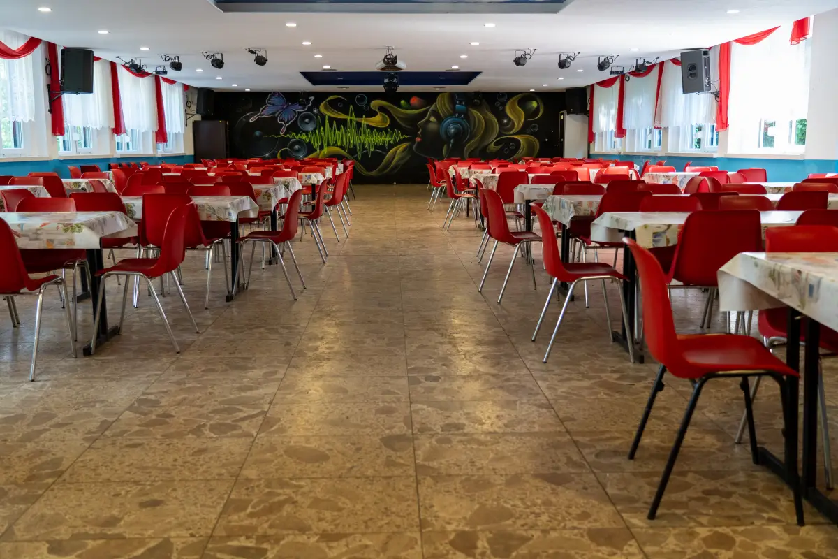 Unser weitläufiges Feriendorf 'Hoher Hain' liegt am Stadtrand von Limbach-Oberfrohna und mitten im Grünen. Du wohnst im Bettenhaus mit 4-Bettzimmern und zweckmäßigen, auf dem Flur gelegenen Sanitäranlagen. Unsere leckere Vollverpflegung wird dir in einem gemütlichen Speiseraum serviert.